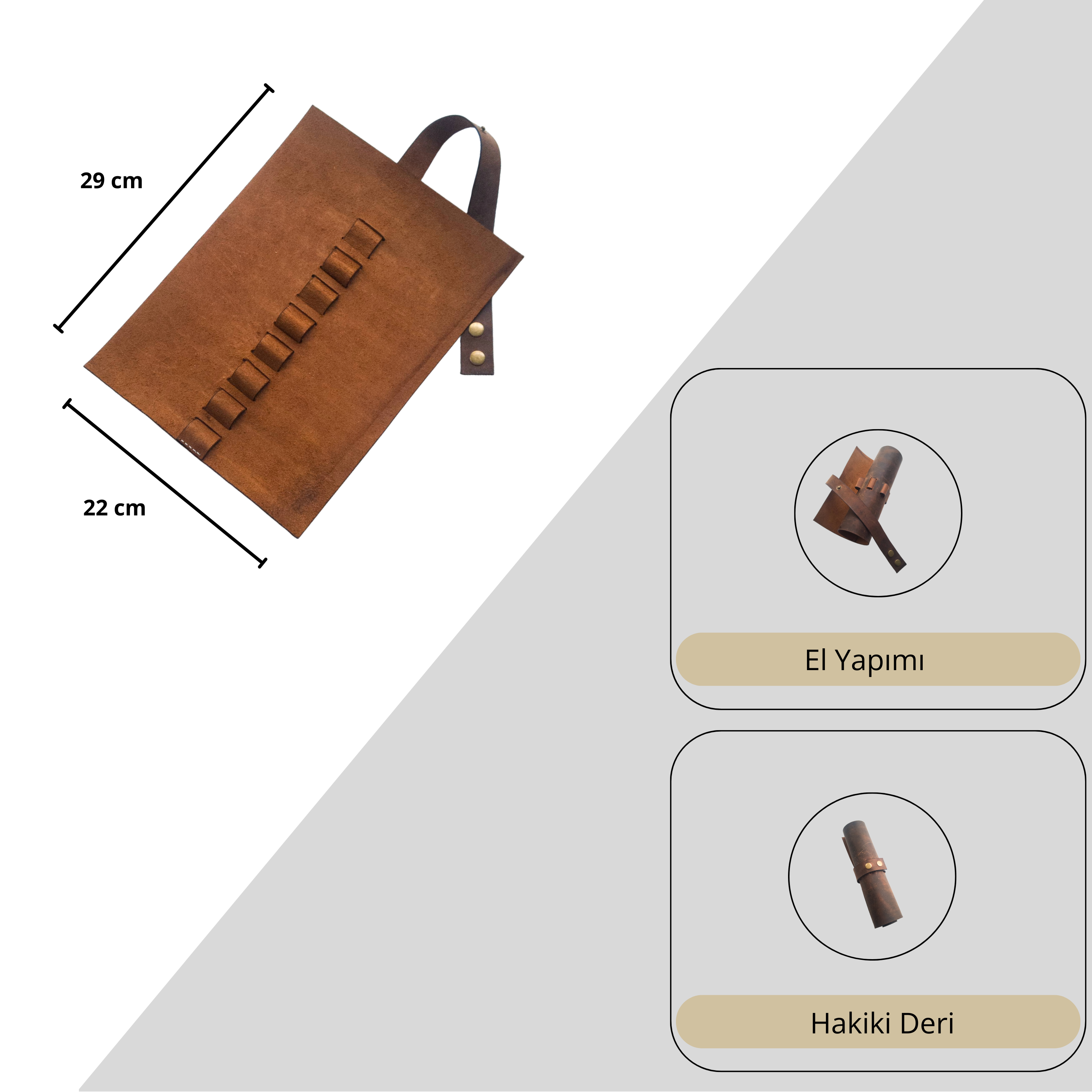 Bu el yapımı hakiki deri kalemlik, benzersiz tasarımı ve kaliteli işçiliği ile göze çarpıyor. Crazy Horse deriden üretilen bu kalemlik, kalemleri güvenli bir şekilde korur ve taşımayı kolaylaştırır. Şık ve vintage görünümü ile ofis masanızı veya çalışma alanınızı süsleyecektir. Kullanışlı ve zarif bir aksesuar olarak kalemleri düzenli tutmanıza yardımcı olur. Uzun yıllar boyunca kullanabileceğiniz bu deri kalemlik, el işçiliğinin güzelliğini yansıtır.